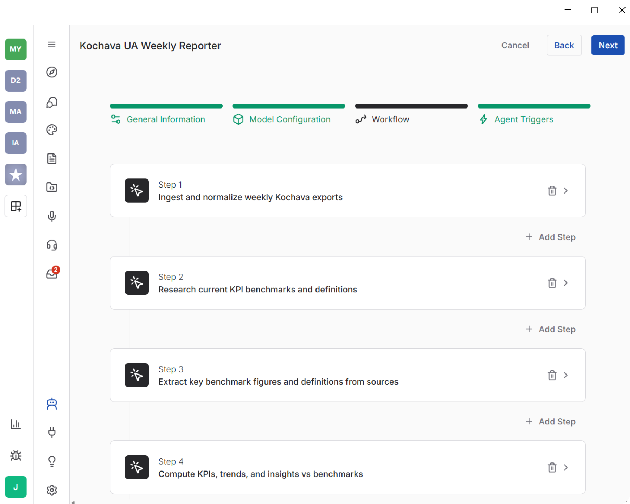 Seamlessly build and run agentic workflows leveraging different models, pre-prompts, RAG interfaces, and MCP connections.