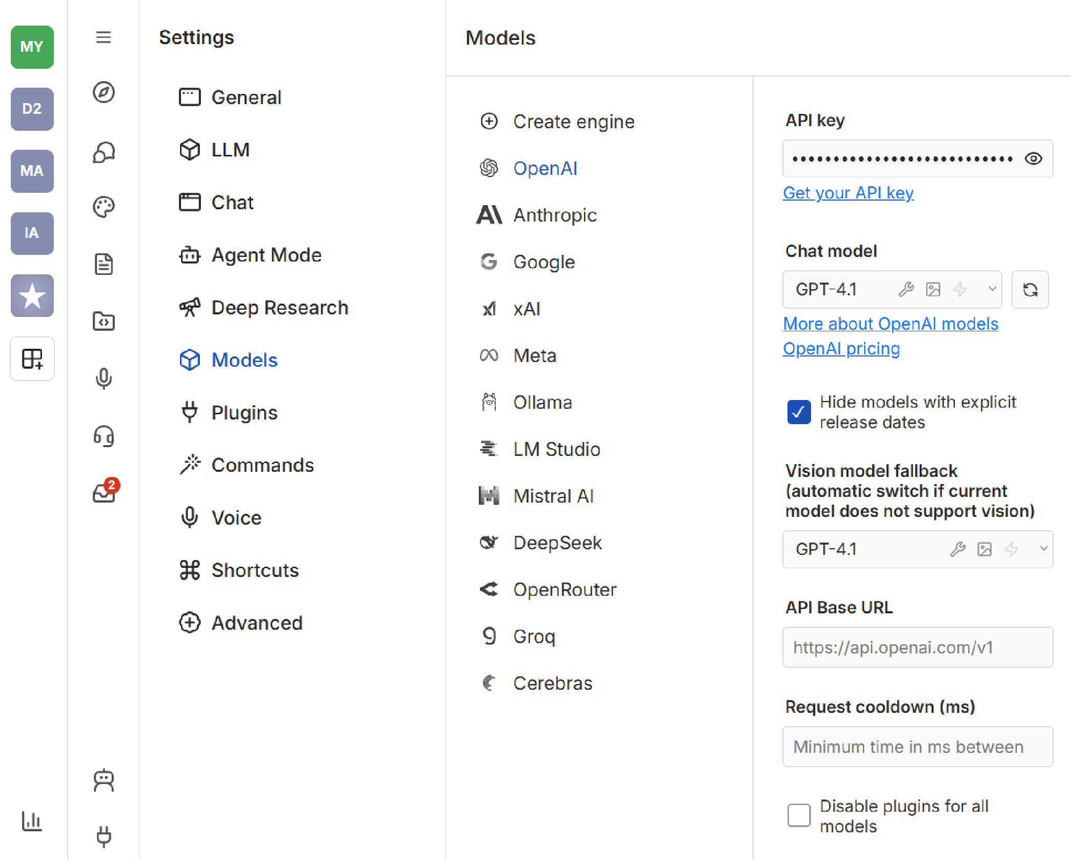 Switch between Claude Sonnet, GPT-4, and other models seamlessly. Manage all your AI models and providers from one interface.